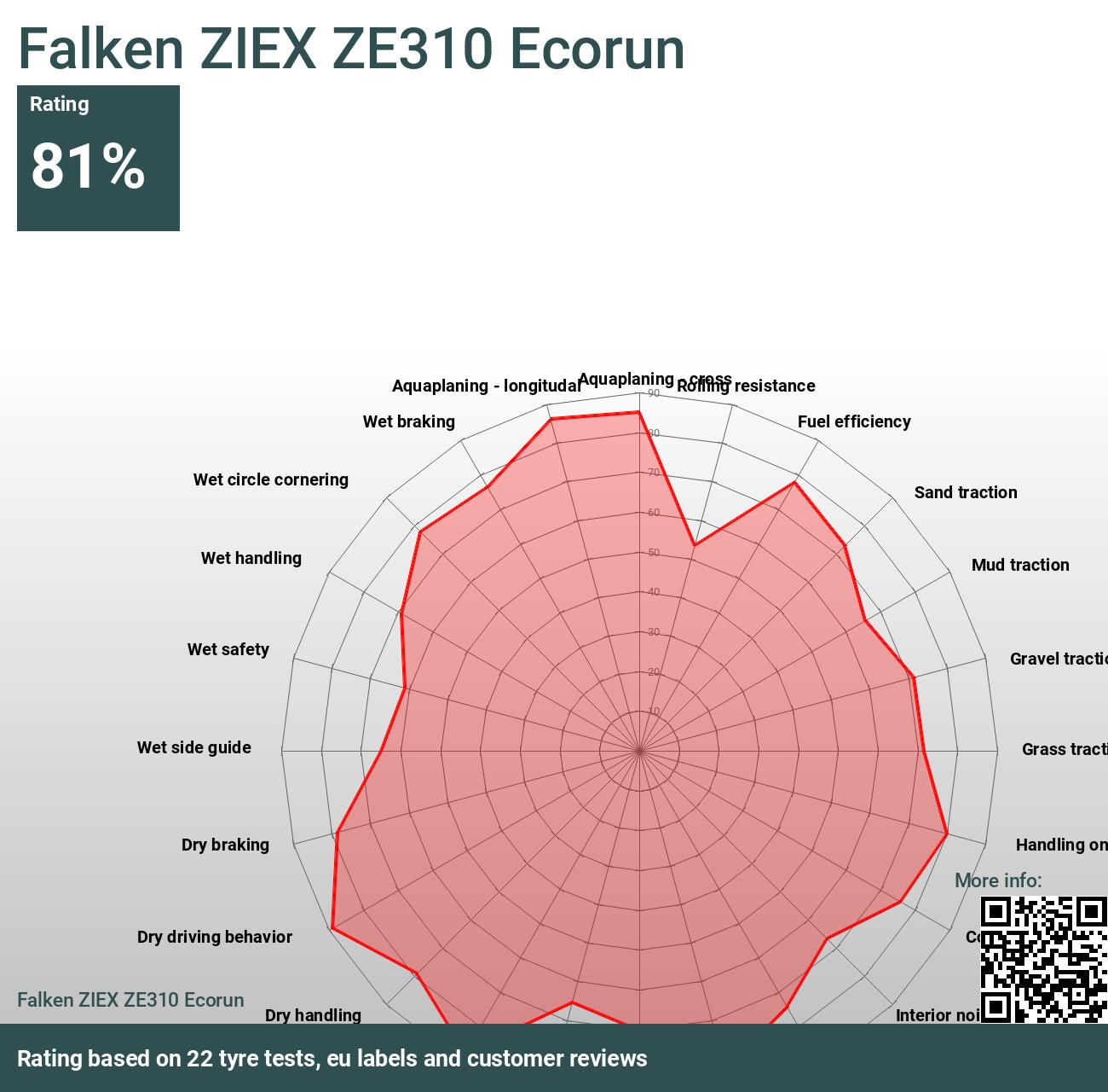 Finalizando em 8º lugar entre 10 concorrentes, o Falken ZIEX ZE310 Ecorun obteve uma classificação final de 'Satisfatório'. Essa classificação destaca seu desempenho em diversas disciplinas testadas, com suas principais qualidades sendo sua condução equilibrada e estável em superfícies secas e boas margens de segurança em situações de aquaplanagem. Sua resistência ao rolamento mais baixa também foi notável, juntamente com um nível de preço atraente. No entanto, ele demonstrou subesterço em superfícies molhadas e uma resposta atrasada no comportamento de direção. O desempenho de frenagem em estradas secas foi considerado médio. Notavelmente, o pneu foi incomparável em seu desempenho na aquaplanagem - resistência longitudinal e de rolamento, mostrando suas capacidades especializadas nessas áreas.
